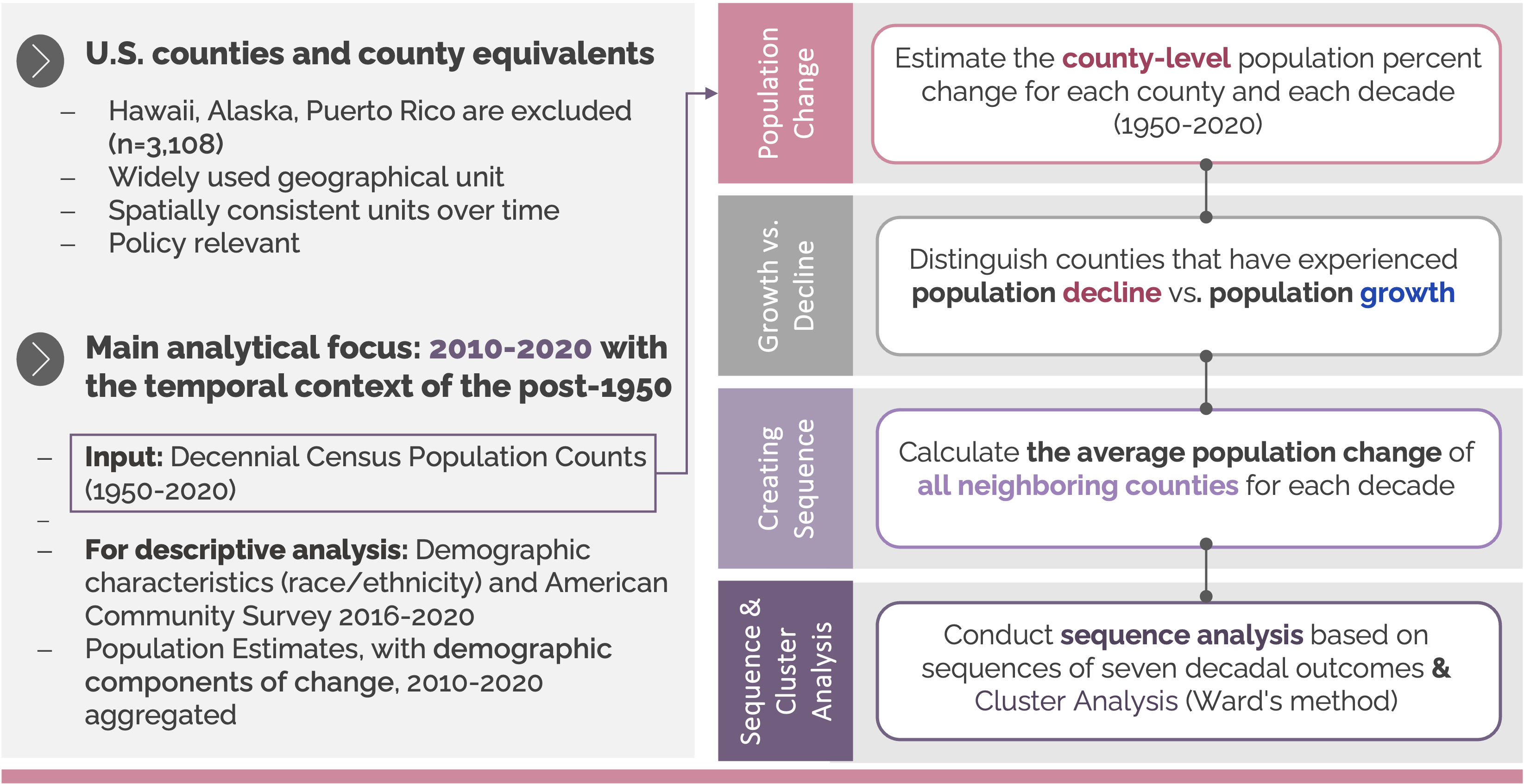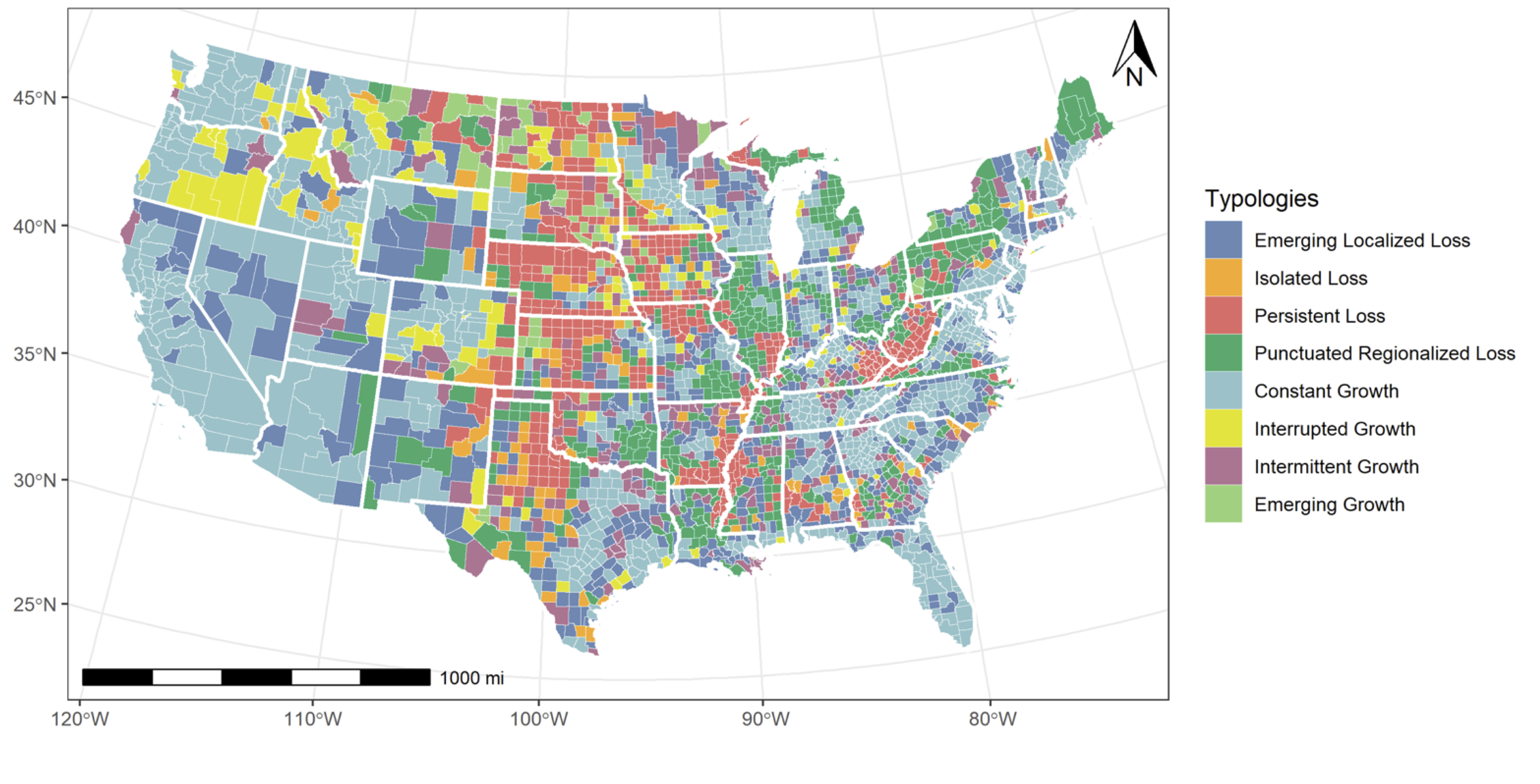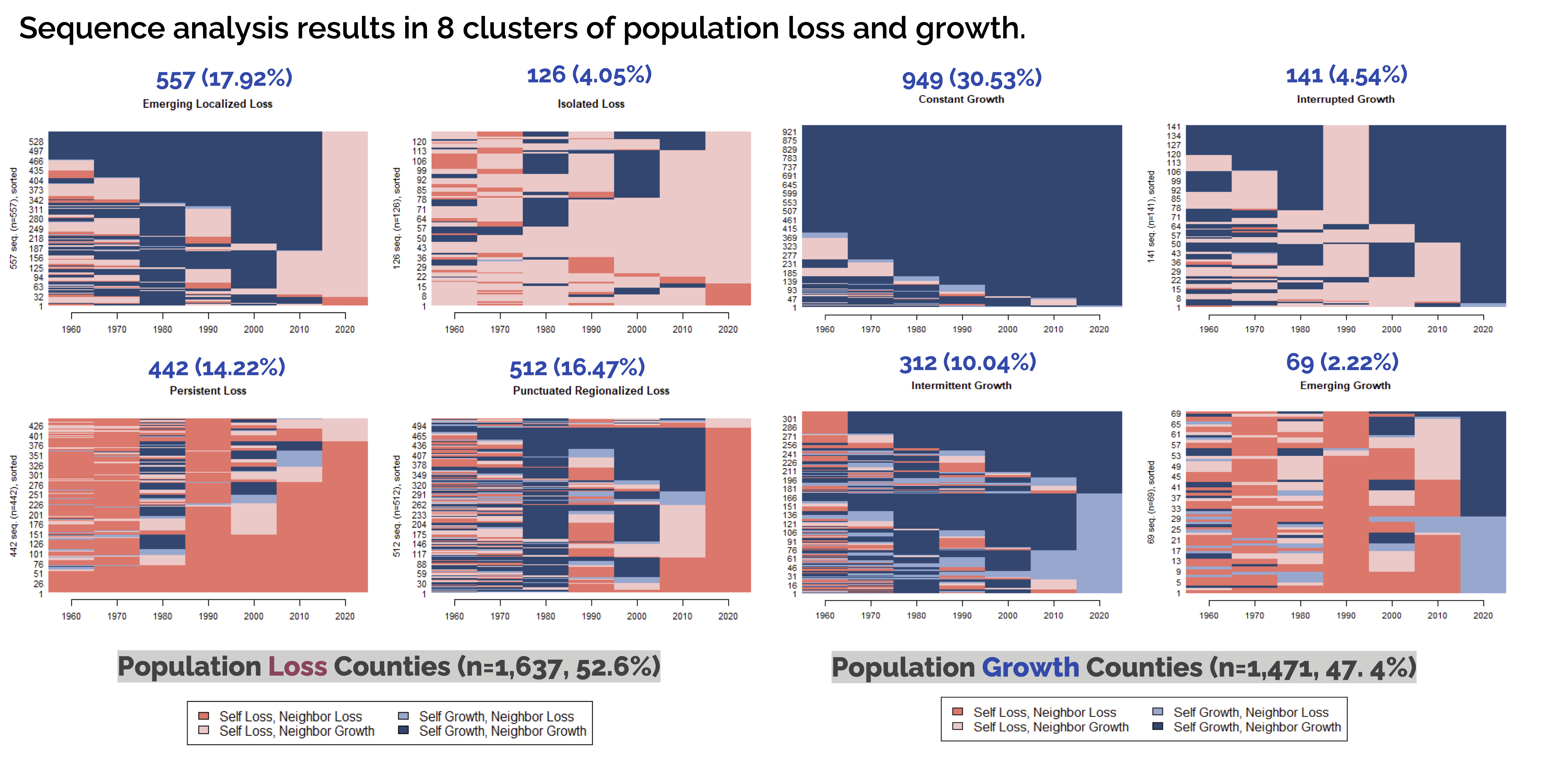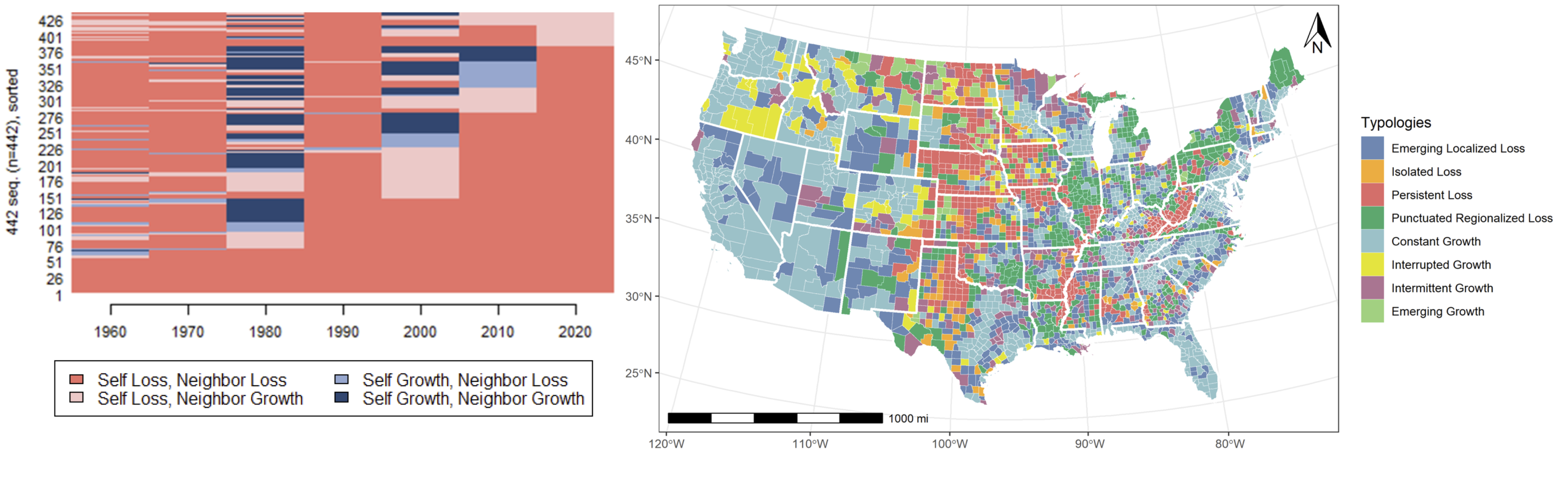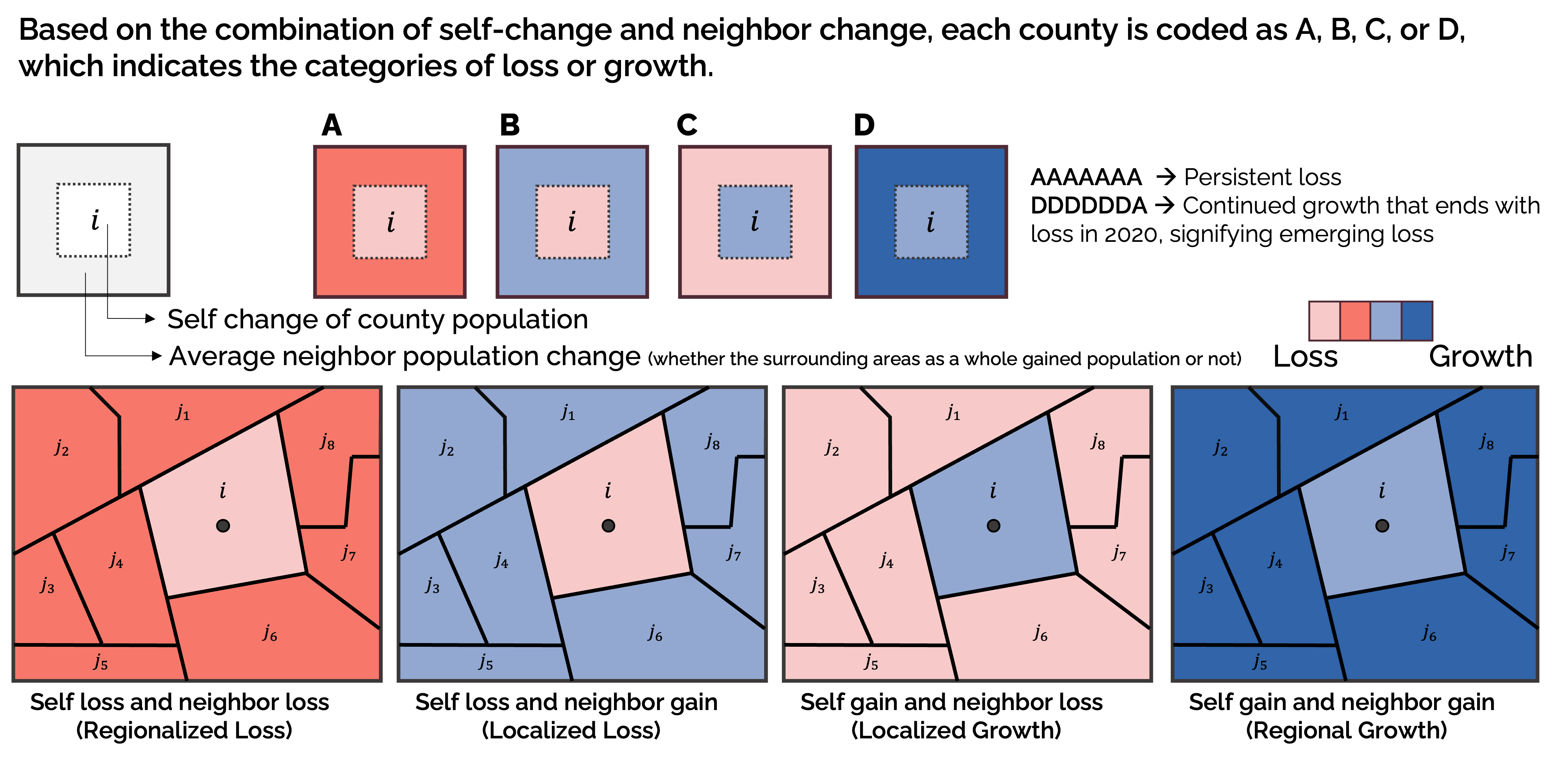 Our typology approach, which groups the patterns of population changes for both individual areas and their neighboring regions over a span of 70 years, provides a detailed understanding of how depopulation has spatially unfolded in the United States